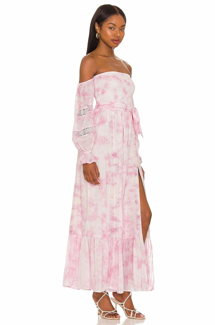 Off shoulder styling with elastic trim - Lightweight eyelet fabric with front seam slit